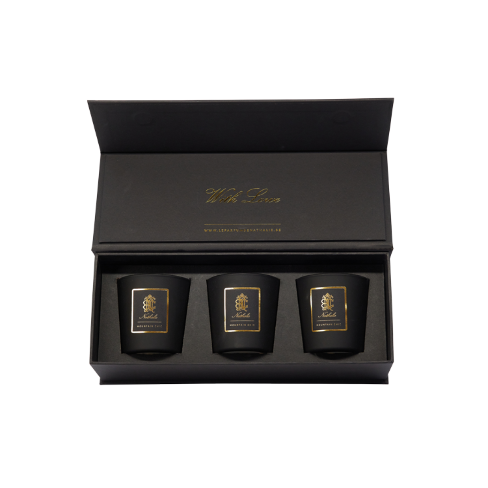 The luxurious packaging in a black box with a candle holder makes these Mountain Chic candles a gift everyone longs for.